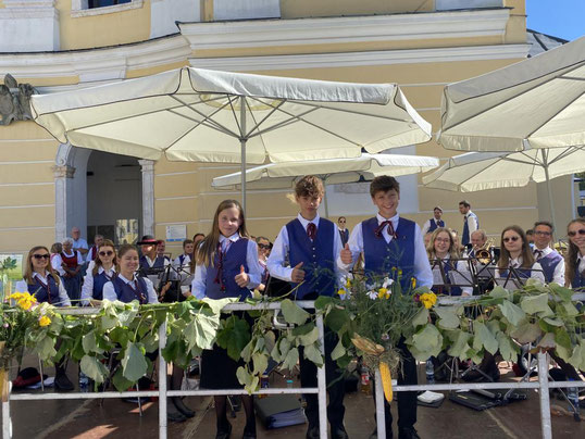in der Basilika Mondsee. Im Anschluss daran spielten wir einen Frühschoppen am Marktplatz. Das herrliche Wetter lockte zahlreiche Besucher an. Rund um den Marktplatz präsentierten die regionalen Aussteller ihre Produkte, und die Gäste konnten eine Vielfalt an